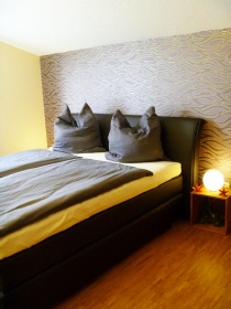 Das Schlafzimmer mit angrenzendem Bad ist mit einem hochwerigem Boxspringbett (180x200) und einem Kleiderschrank ausgestattet.